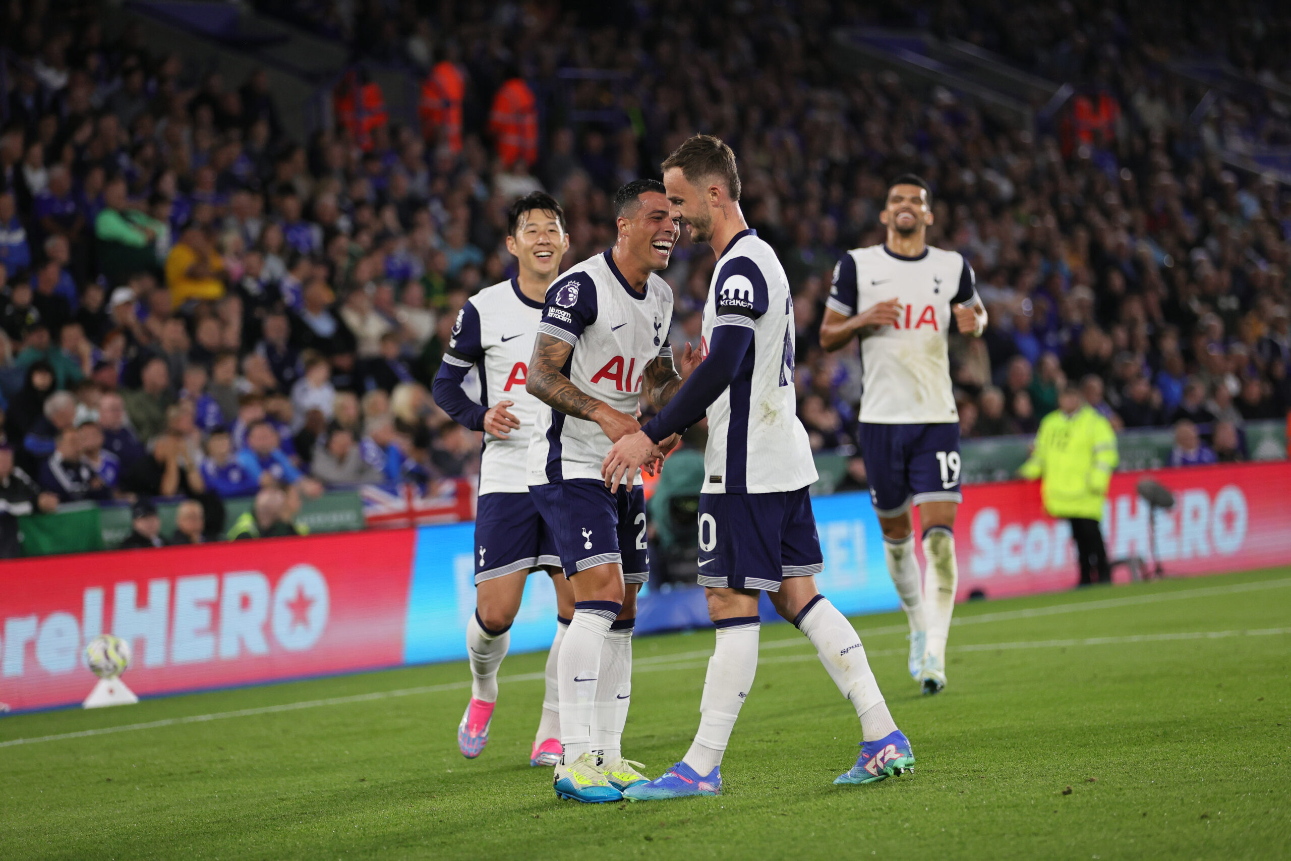 Leicester, England, Aug 19th 2024: Pedro Porro of Tottenham Hotspur celebrates with teammates after scoring the teams first goal during the Premier League football match between Leicester City and Tottenham Hotspur at King Power Stadium in Leicester, England.  (James Holyoak/SPP) (Photo by James Holyoak/SPP/Sipa USA)