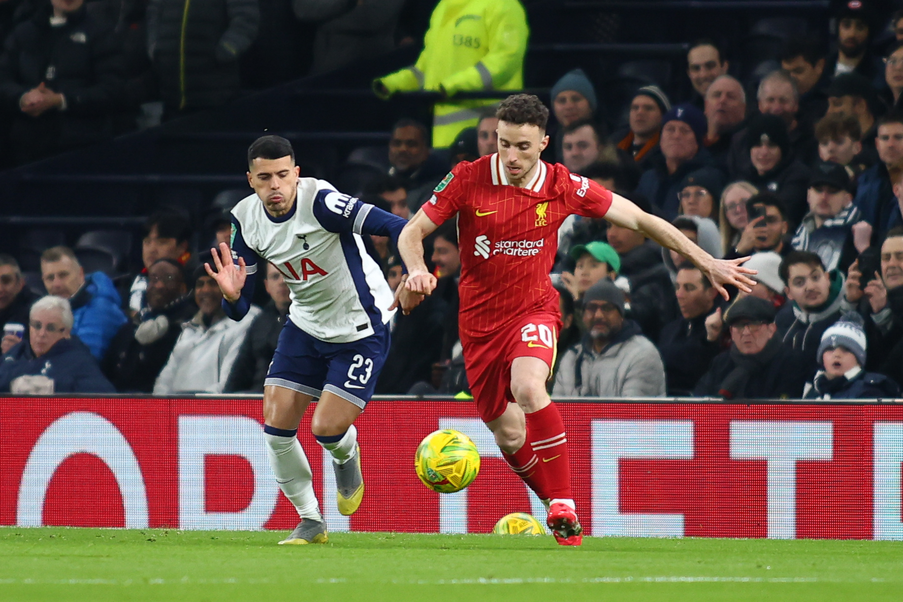 London, England, January 8th 2025: Pedro Porro (23 Tottenham Hotspur) and Diogo Jota (20 Liverpool) fight for the ball during the EFL Cup match between Tottenham Hotspur and Liverpool at Tottenham Hotspur Stadium  in London, England  (Alexander Canillas/SPP) (Photo by Alexander Canillas/SPP/Sipa USA)
