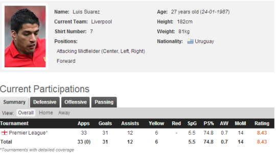 Najlepszym piłkarzem zakończonego niedawno sezonu w Premier League wybrany został Luis Suarez. Snajper Liverpoolu ma za sobą fantastyczne miesiące, podczas których utrzymywał swój zespół w walce o mistrzostwo kraju. Czy to jednak faktycznie Urugwajczyk był tym najlepszym z najlepszych minionych rozgrywek? Można mieć co do tego uzasadnione wątpliwości.