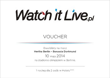 §IV. Nagrody 1. Fundatorem nagród jest firma: WatchItLive.pl 2. Nagrodą są bilety ufundowane przez firmę WatchItLive.pl. – jedna podwójna wejściówka na mecz Hertha Berlin – Borussia Dortmund oraz nocleg w pokoju dwuosobowym w Berlinie. 3. Nagrody przyznawane w ramach Konkursu nie podlegają zamianie na inną nagrodę lub na jej równowartość pieniężną. 4. Uczestnik, któremu została przyznana nagroda, nie może przenieść praw do tej nagrody na osoby trzecie. 5. Uczestnik któremu została przyznana nagroda, ma prawo zrzec się prawa do przyznanej mu nagrody, składając Organizatorowi stosowne oświadczenie w tym zakresie na piśmie. 6. Wszystkie nagrody zostaną przekazane Laureatom do dnia 20 kwietnia 2014roku. 7. W przypadku nie podjęcia przez Laureata Konkursu nagrody w terminie 14 dni od dnia postawienia jej do dyspozycji Laureata, prawo do nagrody wygasa. 8. Laureatom nie przysługuje prawo do wyboru nagrody i zastrzeżenia szczególnych właściwości nagród. 9. Laureaci nie są uprawnieni do odstąpienia lub zbycia nagrody osobom trzecim. W przypadku odstąpienia lub zbycia takiej nagrody osobie trzeciej: a) Organizator nie gwarantuje możliwości realizacji nagrody przez takie osoby trzecie oraz b) Organizator zastrzega sobie prawo do żądania zwrotu nagrody.