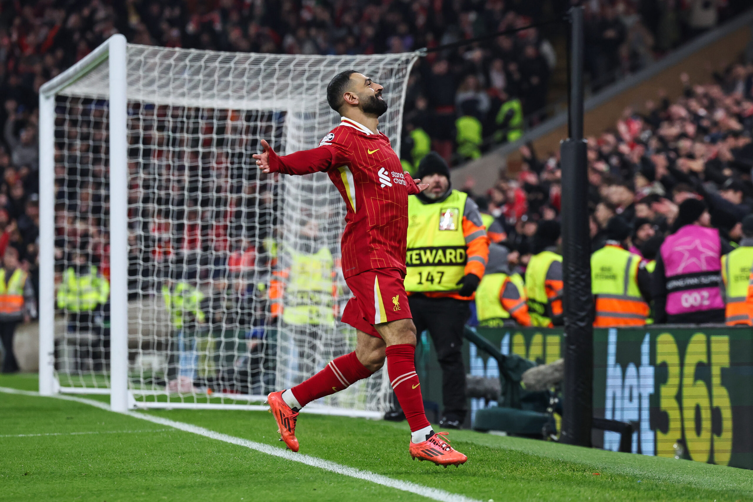 Mohamed Salah of Liverpool celebrates his goal to make it  1-0 during the UEFA Champions League - League Stage Liverpool v Lille at Anfield, Liverpool, United Kingdom, 21st January 2025