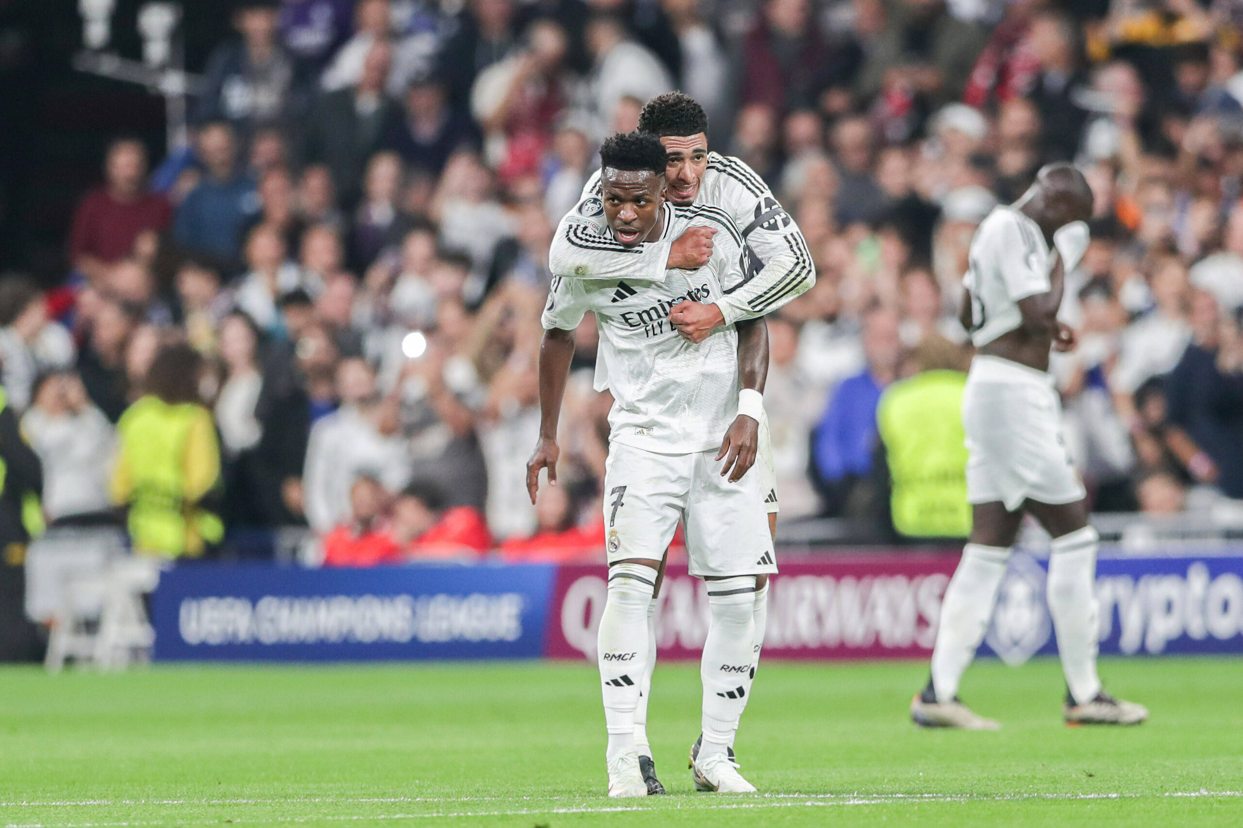 Vinicius Junior of Real Madrid (L) and Jude Bellingham of Real Madrid (R) celebrate after scoring a goal during the UEFA Champions League match between Real Madrid and AC Milan at Estadio Santiago Bernabeu. Final Score; Real Madrid 1:3 AC Milan. - Grzegorz Wajda / SOPA Images//SOPAIMAGES_RMAACM_05112024_49/Credit:SOPA Images/SIPA/2411070834