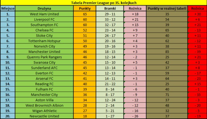 Po 35. kolejkach na czele tabeli znajdowałby się West Ham United. Drużyna Sama Allardyce’a ma w tym sezonie w swoich szeregach takich zawodników jak Andy Carroll, Kevin Nolan czy Carltone Cole, których gole w wielu spotkaniach ważyły o zdobyczy punktowej dla Młotów lub jej braku. Za plecami londyńczyków znalazłby się Liverpool FC, który szczególnie po kupieniu Daniela Sturridge’a oraz powrocie do formy Jordana Hendersona zaliczył bardzo udany finisz sezonu. O świetnej grze i ważnych golach Stevena Gerrarda już nawet nie wspominamy, bo to niemal norma na angielskich boiskach. Trzecie miejsce przypadło w udziale drużynie, w której na co dzień występuje Artur Boruc, czyli Southampton FC. Święci tuż przed końcem rozgrywek zgromadzili na swoim koncie 60 punktów, czyli o 21 więcej niż mają w rzeczywistości. Nie mogło być jednak inaczej, gdy w swoich szeregach ma się takiego snajpera jak Ricky Lambert, którego dzielnie wspierają James Puncheon i Adam Lallana. Jak się okazało, to mieszanka na miarę podium Premier League.